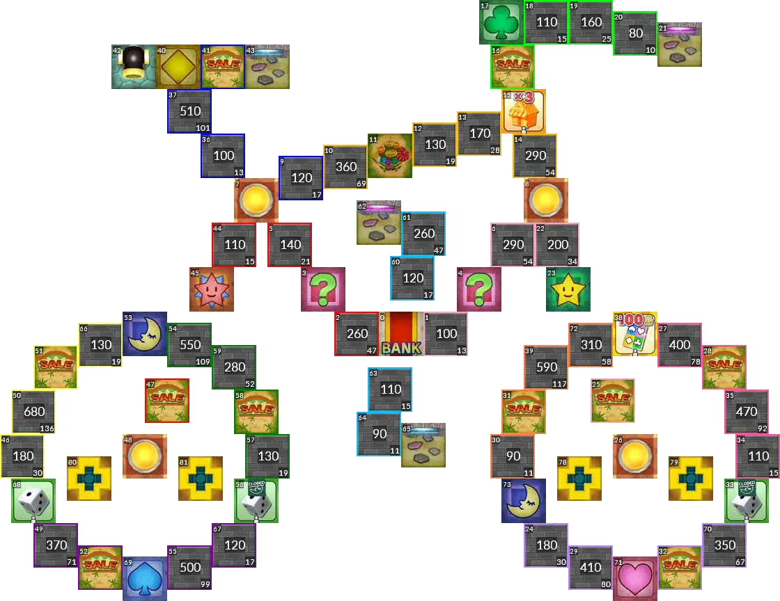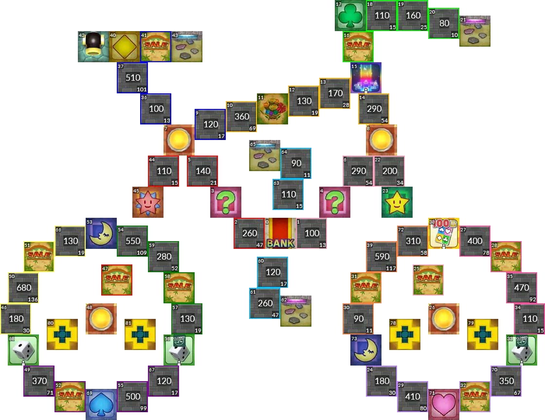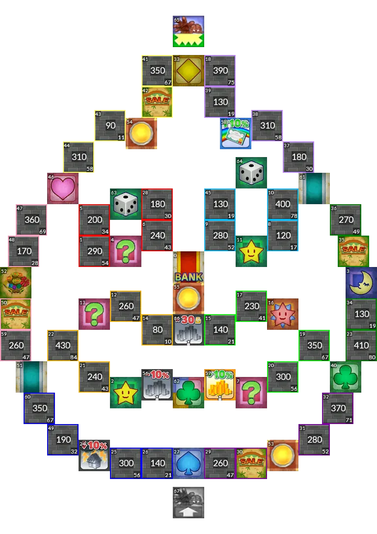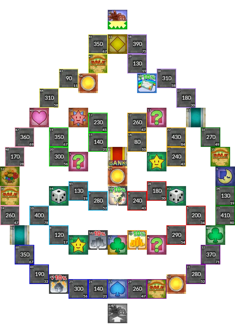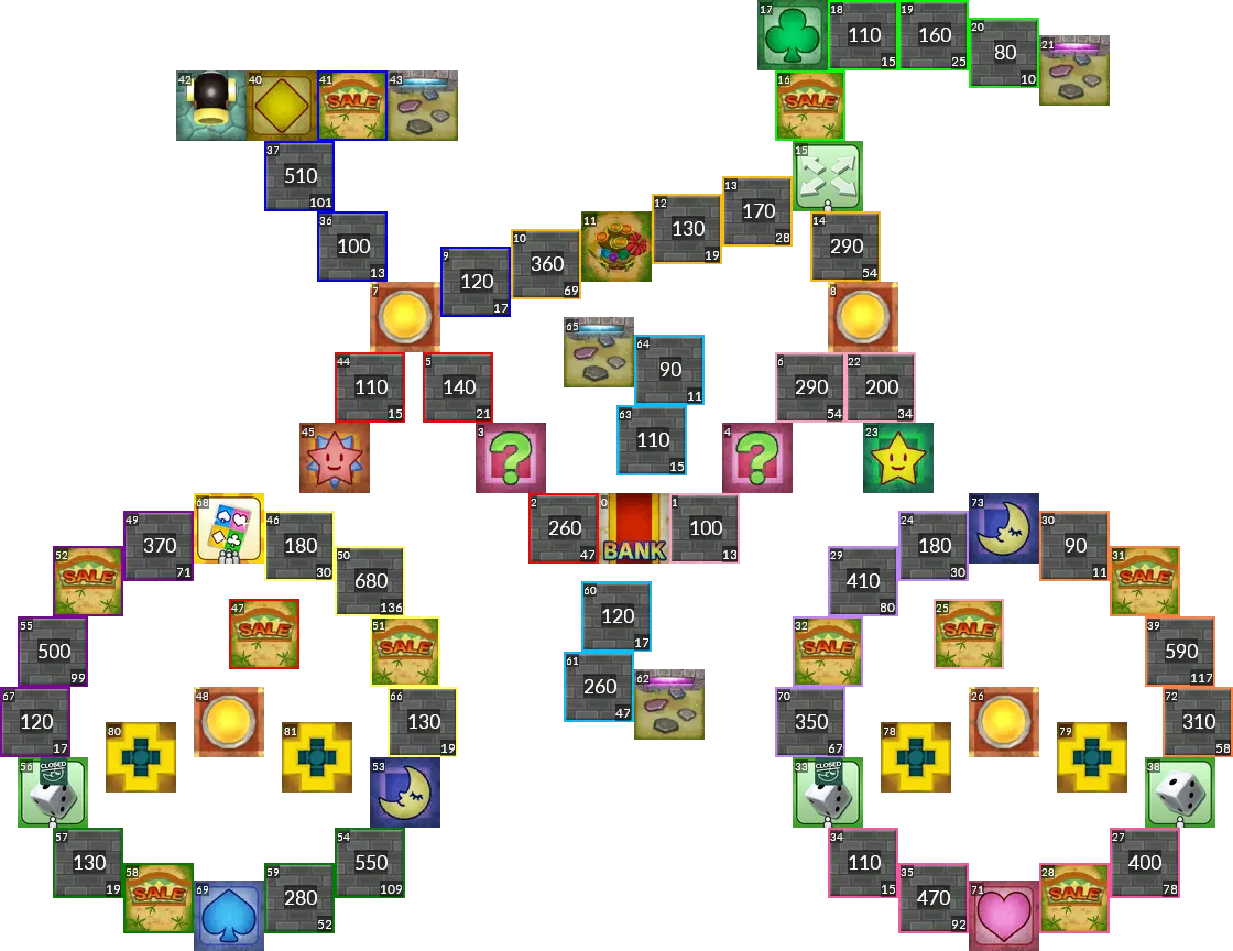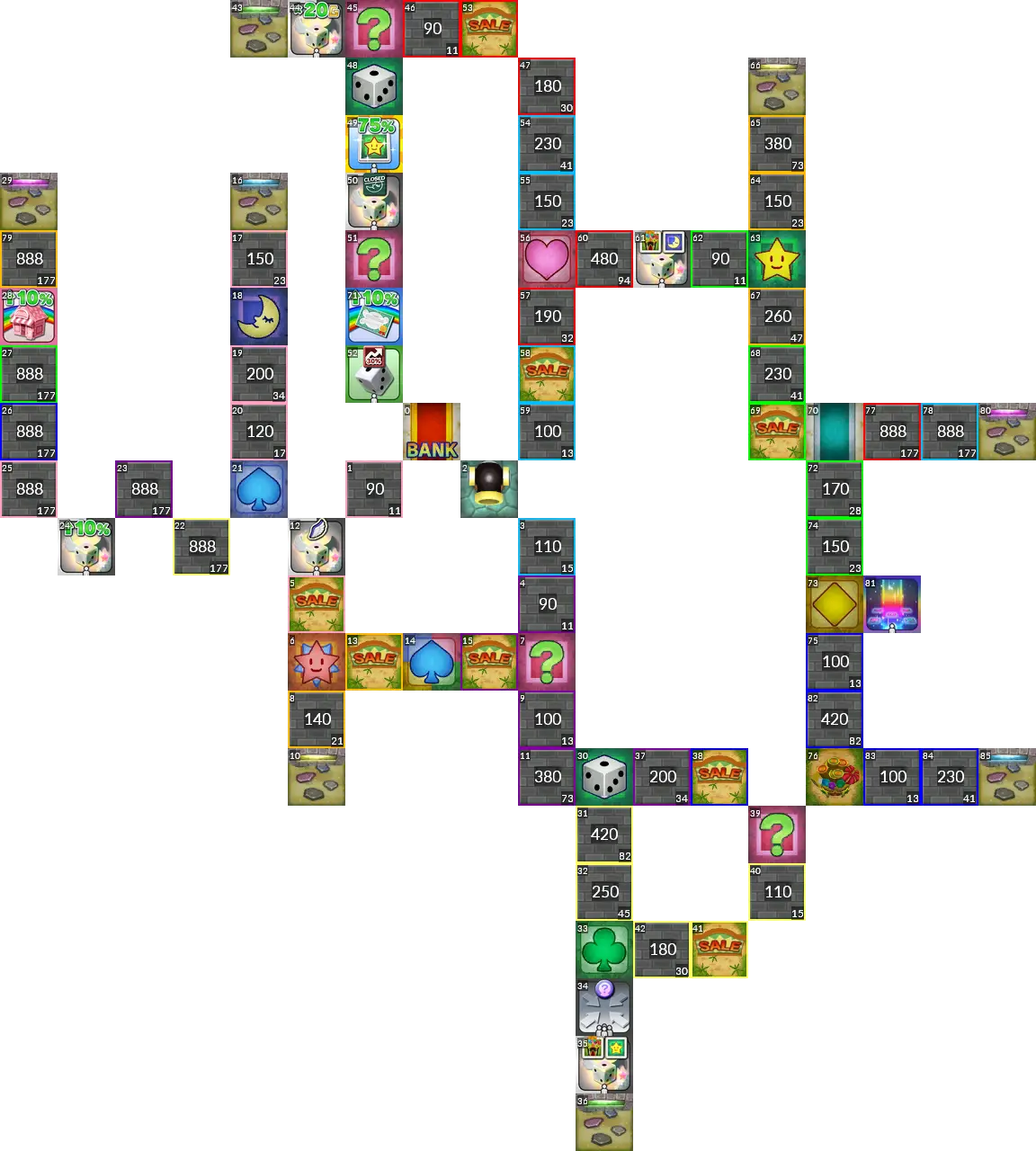 Sushi Train from Itadaki Street 3. The original board had switches which activate upon passing them, but since this isn't possible in Fortune Street Wii, this port uses normal switches instead. Easy mode port.