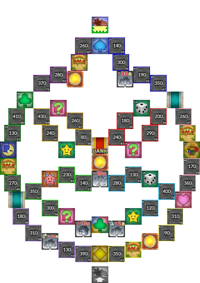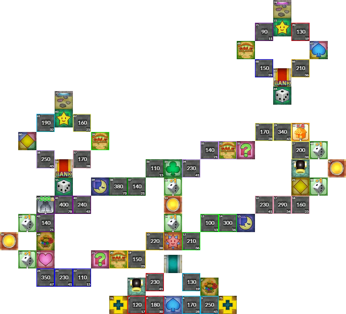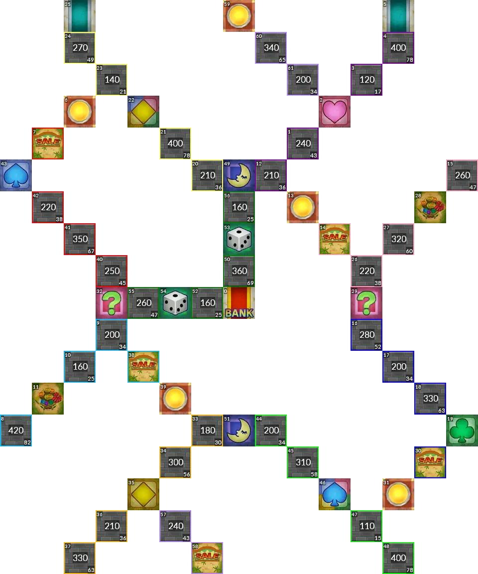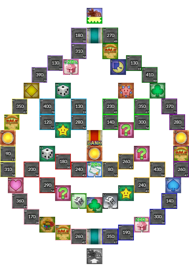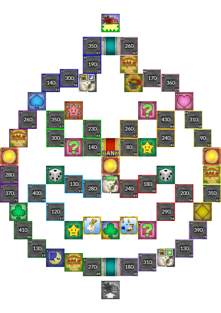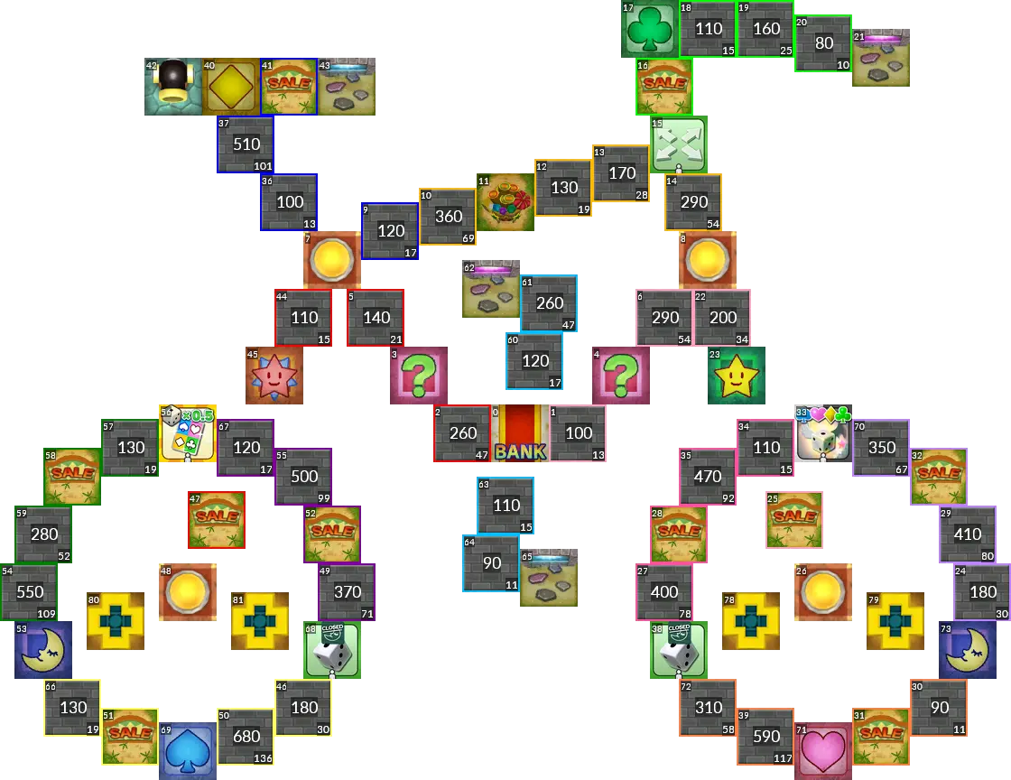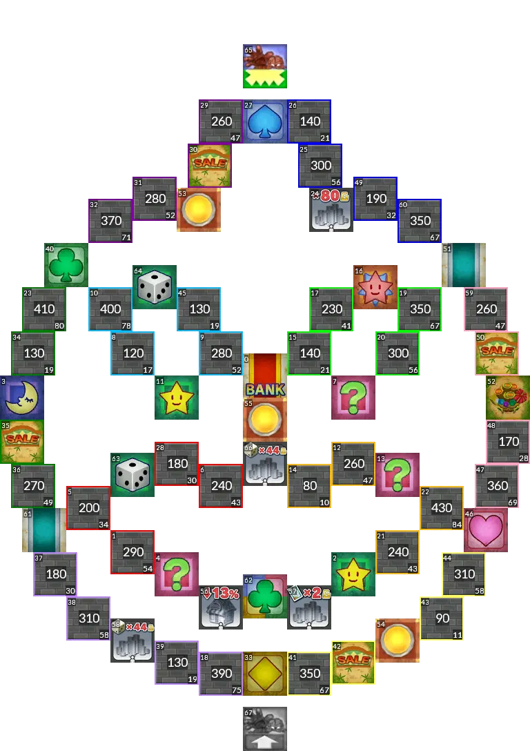 Sushi Train from Itadaki Street 3. The original board had switches which activate upon passing them, but since this isn't possible in Fortune Street Wii, this port uses normal switches instead. Easy mode port.