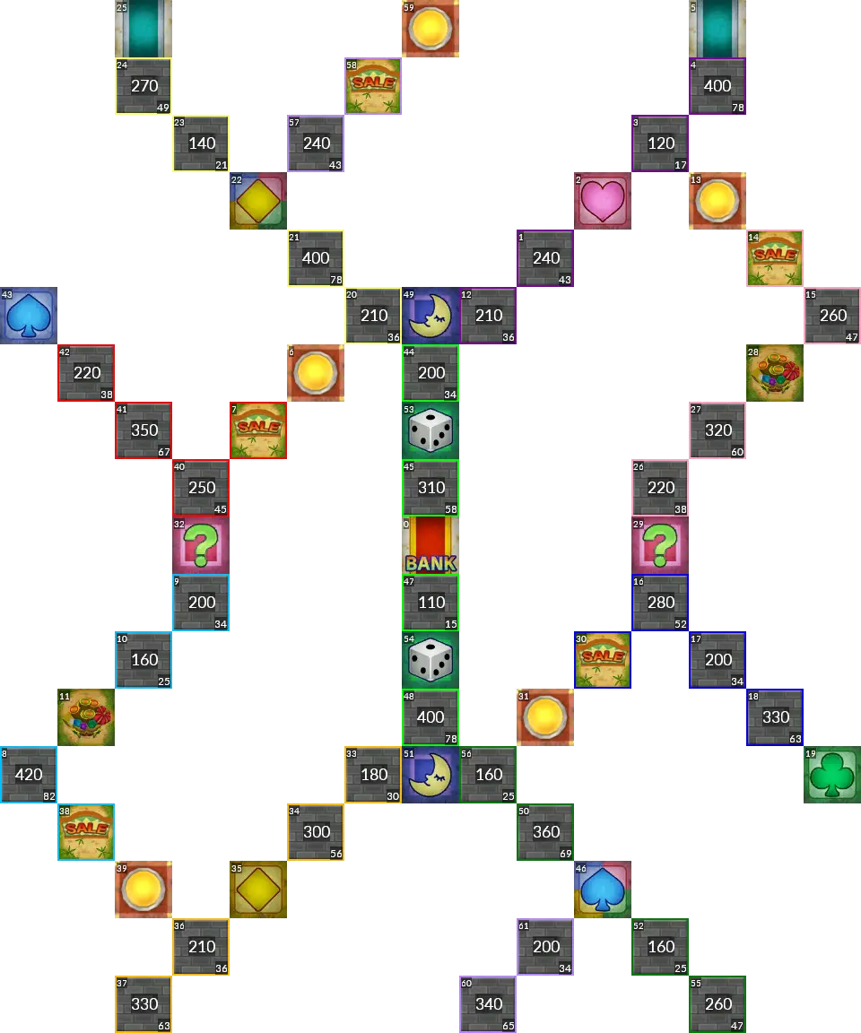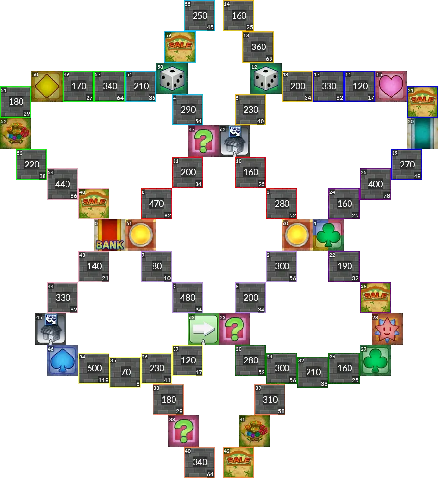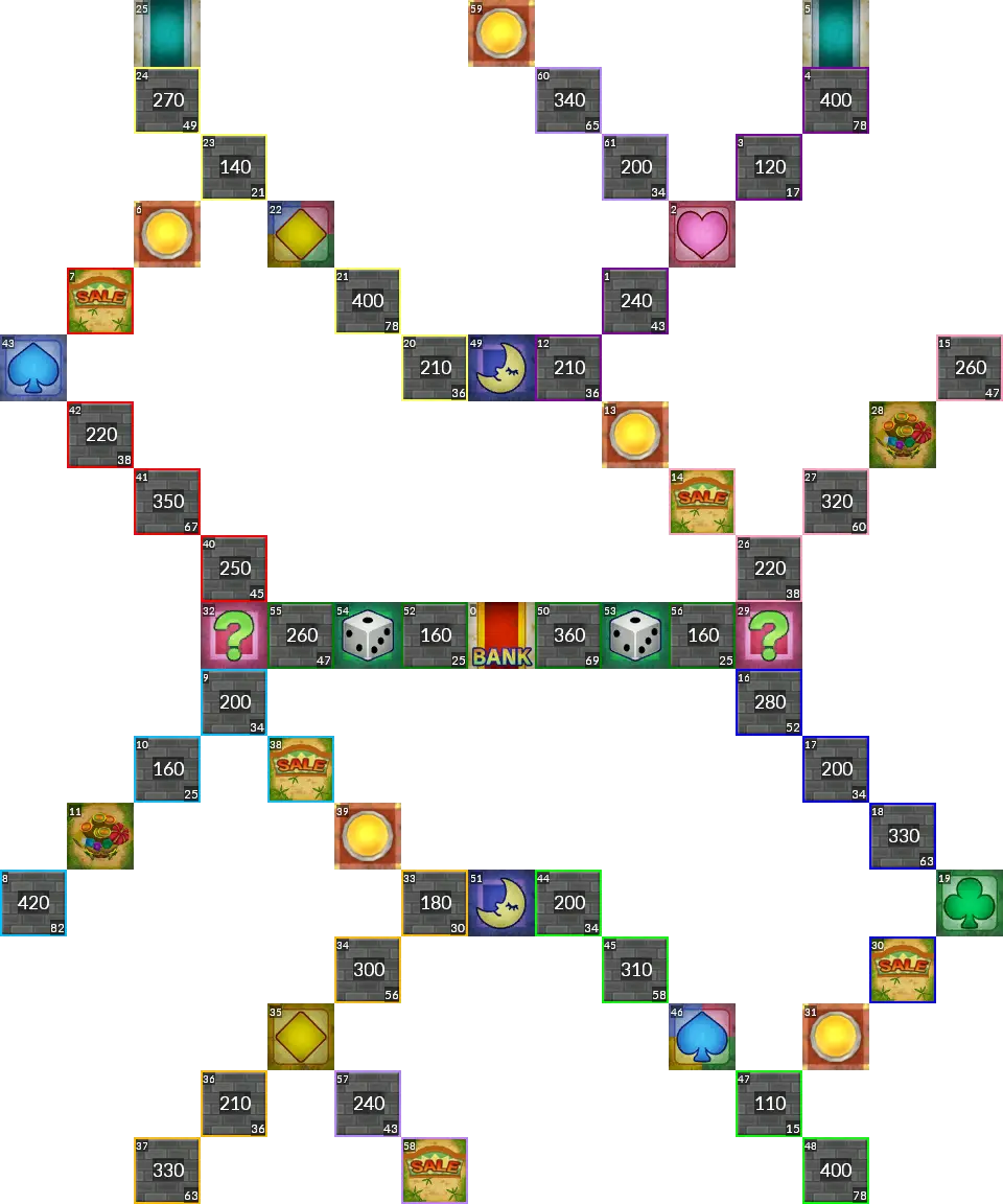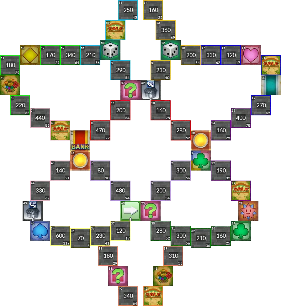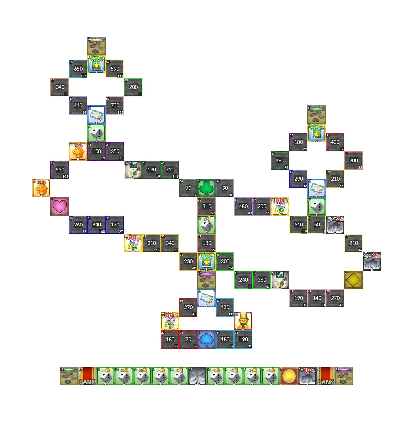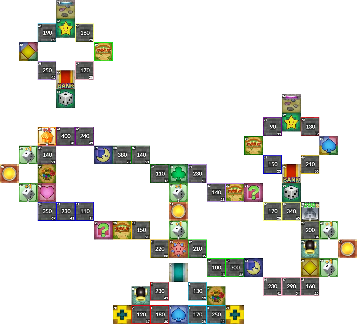 Sushi Train from Itadaki Street 3. The original board had switches which activate upon passing them, but since this isn't possible in Fortune Street Wii, this port uses normal switches instead. Easy mode port.