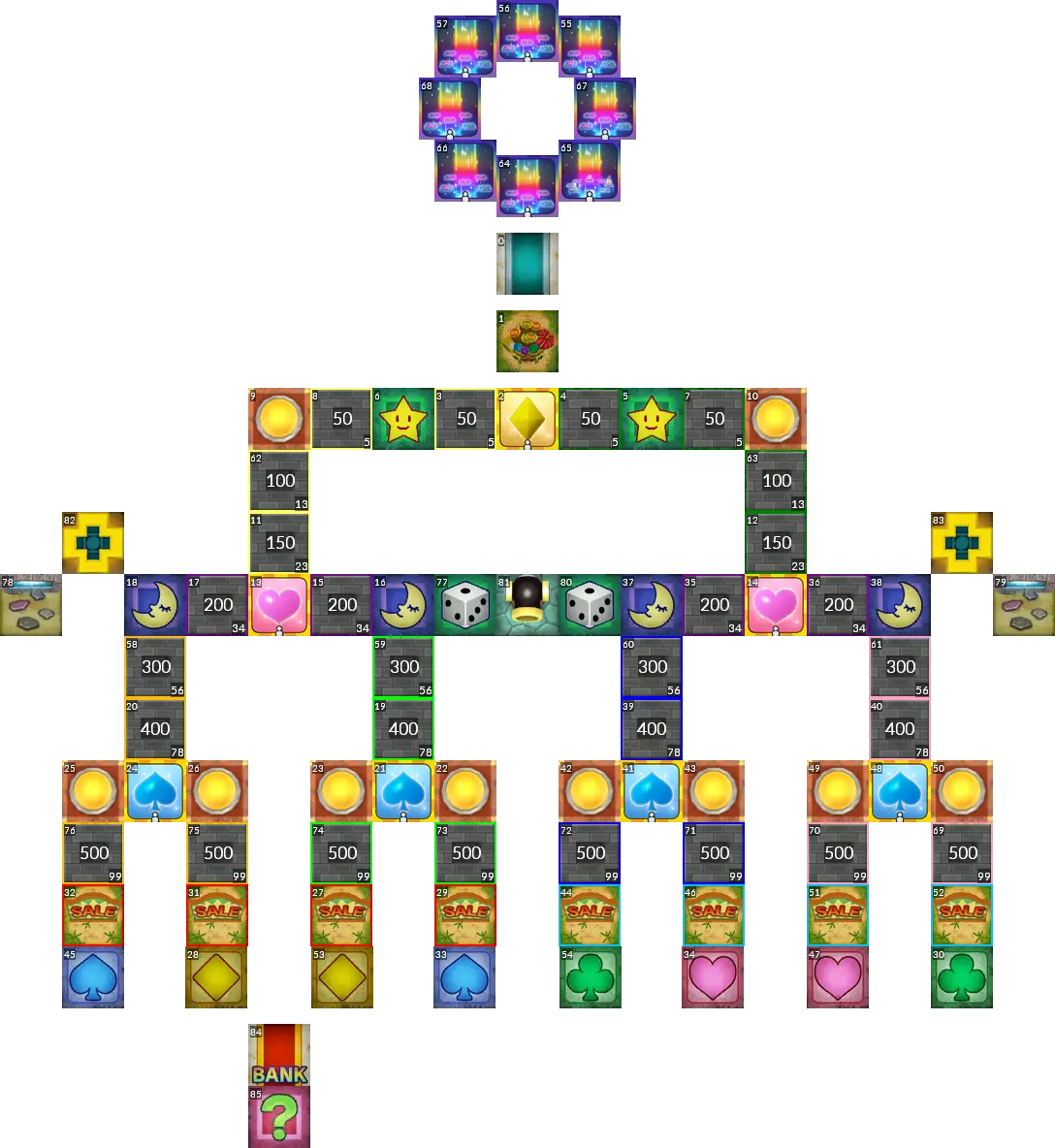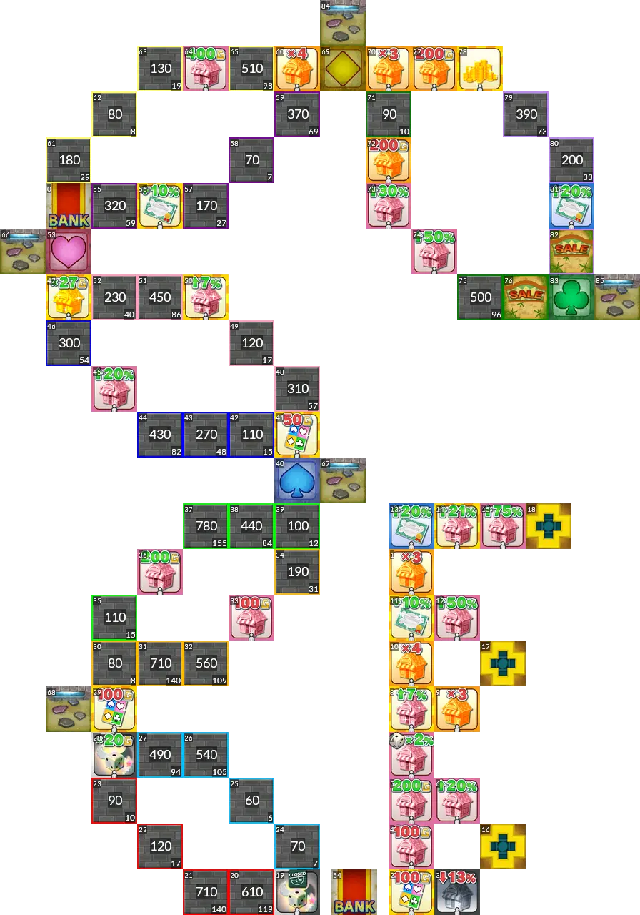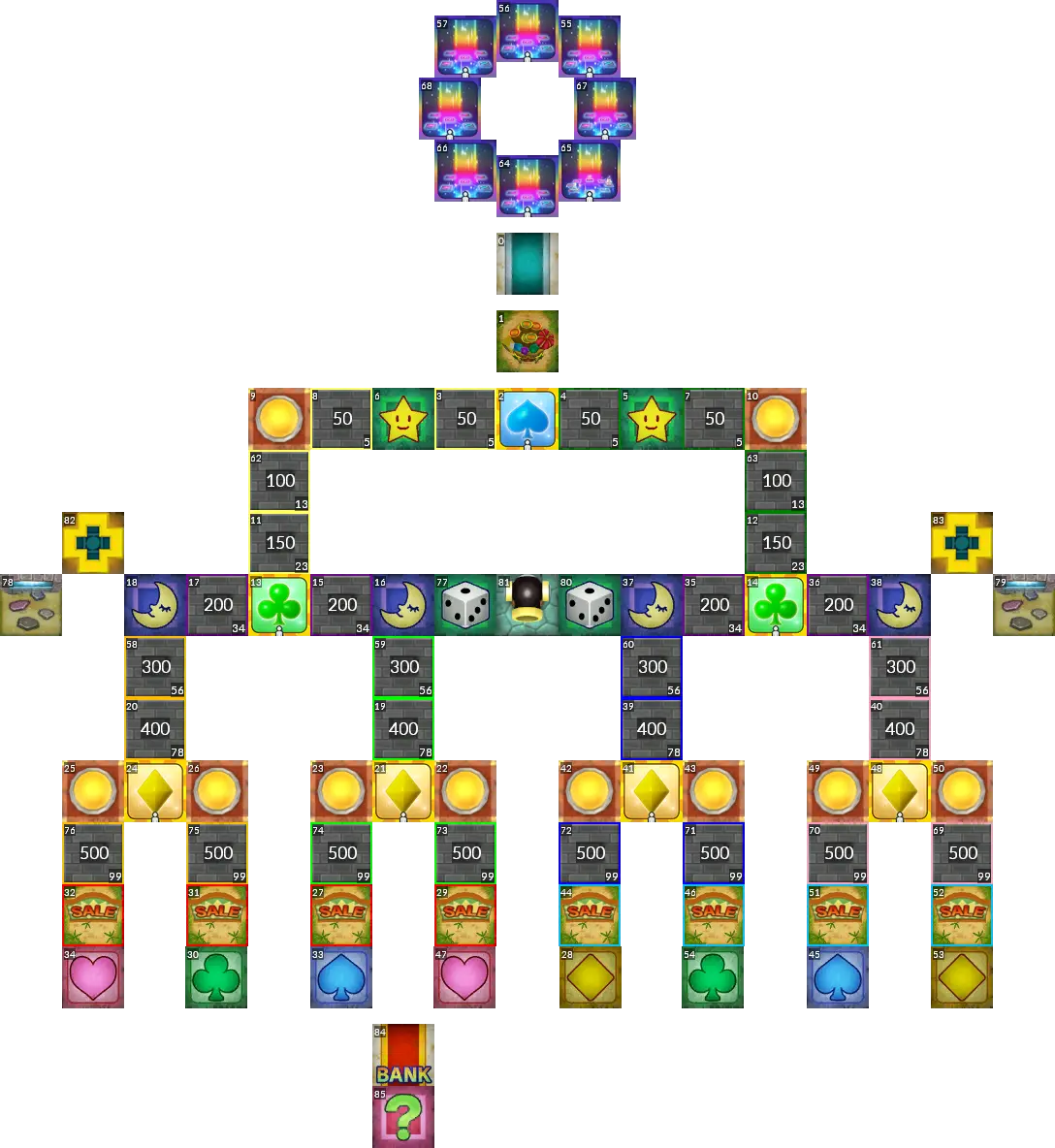 Ported from Itadaki Street 3. Gameplay differs slightly from original. Use the switch to sequentially unlock the four corners of the board. Please don't use B-Button selecting while playing! Recommended for human players.